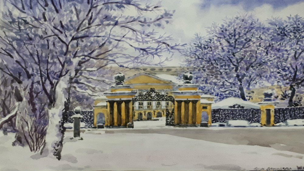 2. сиреневый пейзаж с Усадьбой Демидова. В Москве очень много красивых особняков- усадеб, усадьба Демидова около Третьяковской галереи необыкновенно красива. Сейчас это библиотека, а раньше был знаменитый литературный салон Сологуб. Кованые решетки, удивительные ворота в обрамлении снежных деревьев -необыкновенное по красоте зрелище.