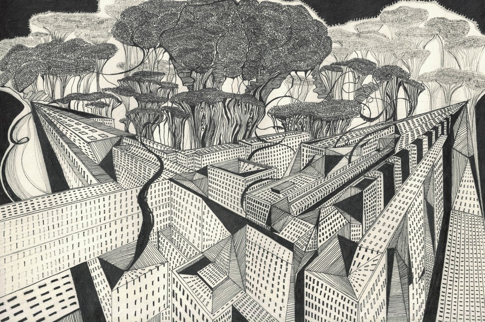 TO LOOK CLOSELY 2020 Paper, rapidograph, ink, liner, gel pen TO LOOK CLOSELY. This is how the term "perspective" or perspicio is translated from Latin. Perspective is the basis of cities. There are many opportunities for everyone in megacities. Tasks, subtasks and riddles intersect here horizontally on streets and vertically on skyscrapers. At the far point of intersection of all lines, the city will give everyone the opportunity to learn their lesson. The city is a network. He broadcasts information to someone, gives feelings, thoughts, and makes connections. And someone will get entangled in it and will be caught. Are we rushing to the cities or do we have no choice, and the cities absorb us with their noisy multicolored PERSPECTIVE? We hurry and seek ourselves in them, building up more and more new areas, we lift ourselves to the sky. But are our aims right?
