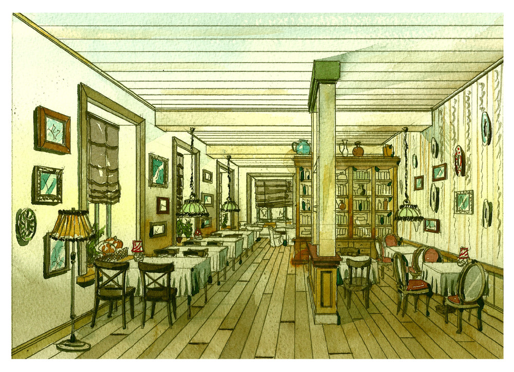 Interior concept. Sketches for a family restaurant in walking distance,performed in numerous wooden structures,supplemented by everyday objects and paintings.